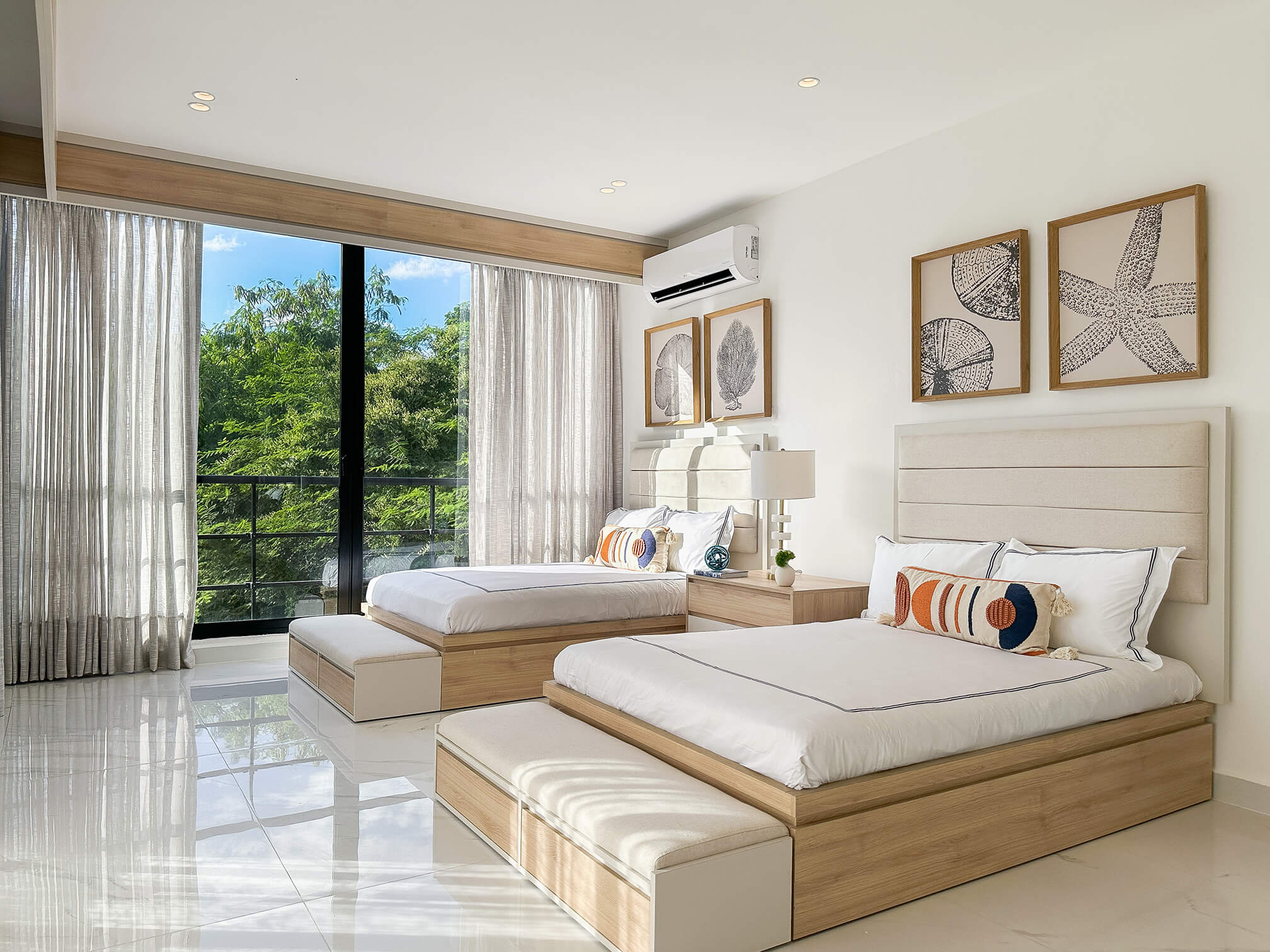Los tonos beige, arena y blanco se combinan con maderas naturales para aportar calidez y equilibrio visual en todos los espacios.