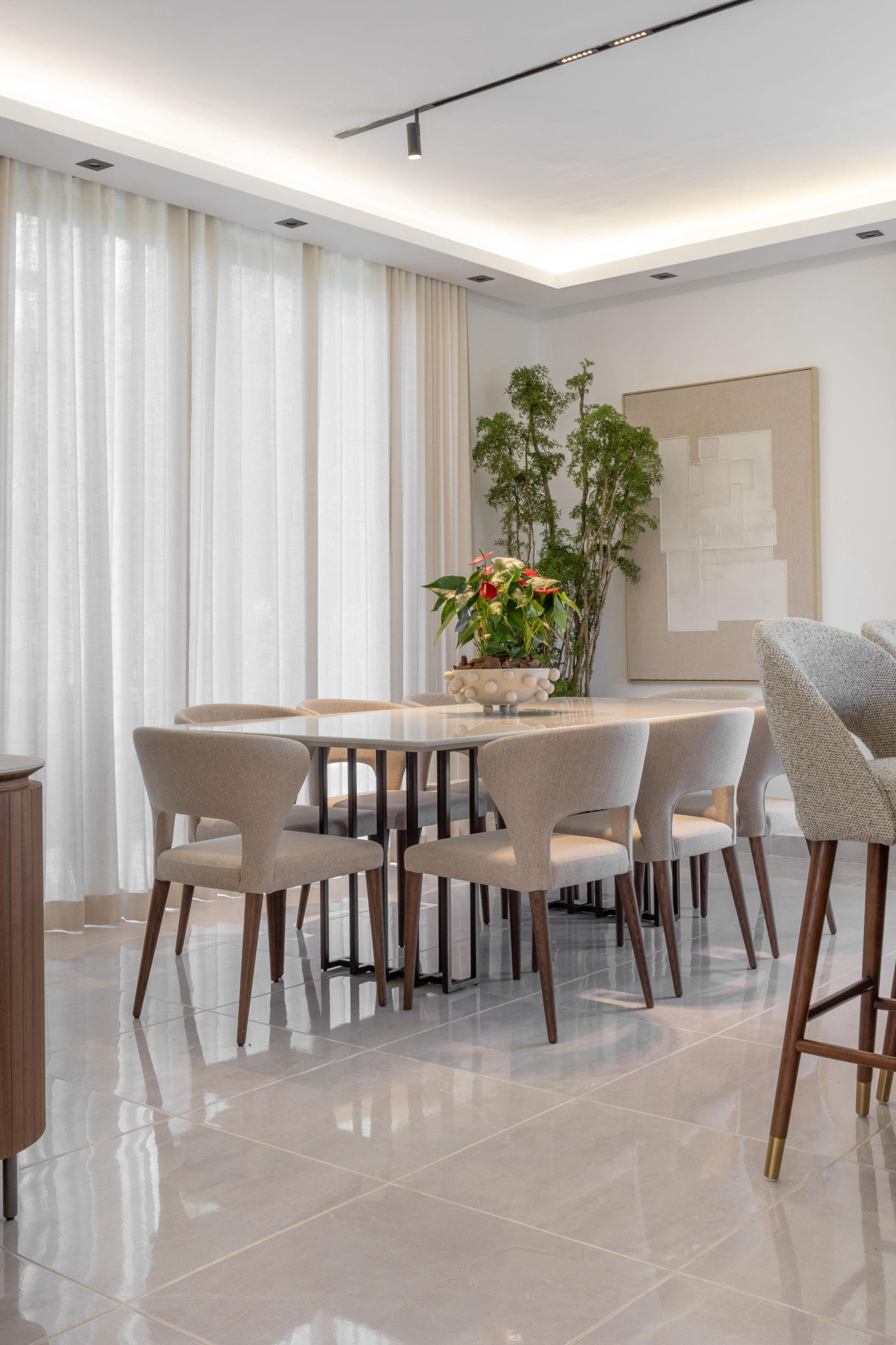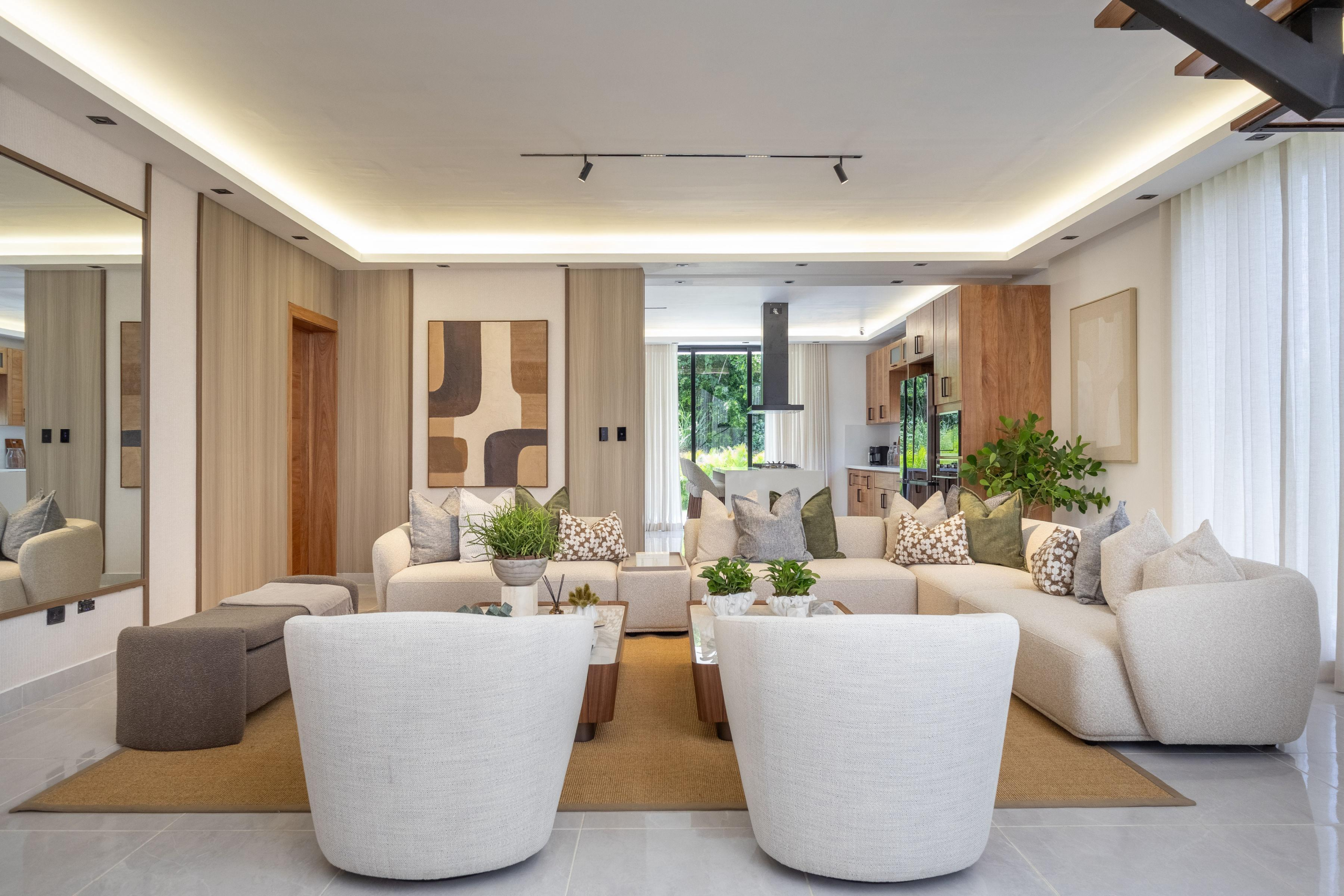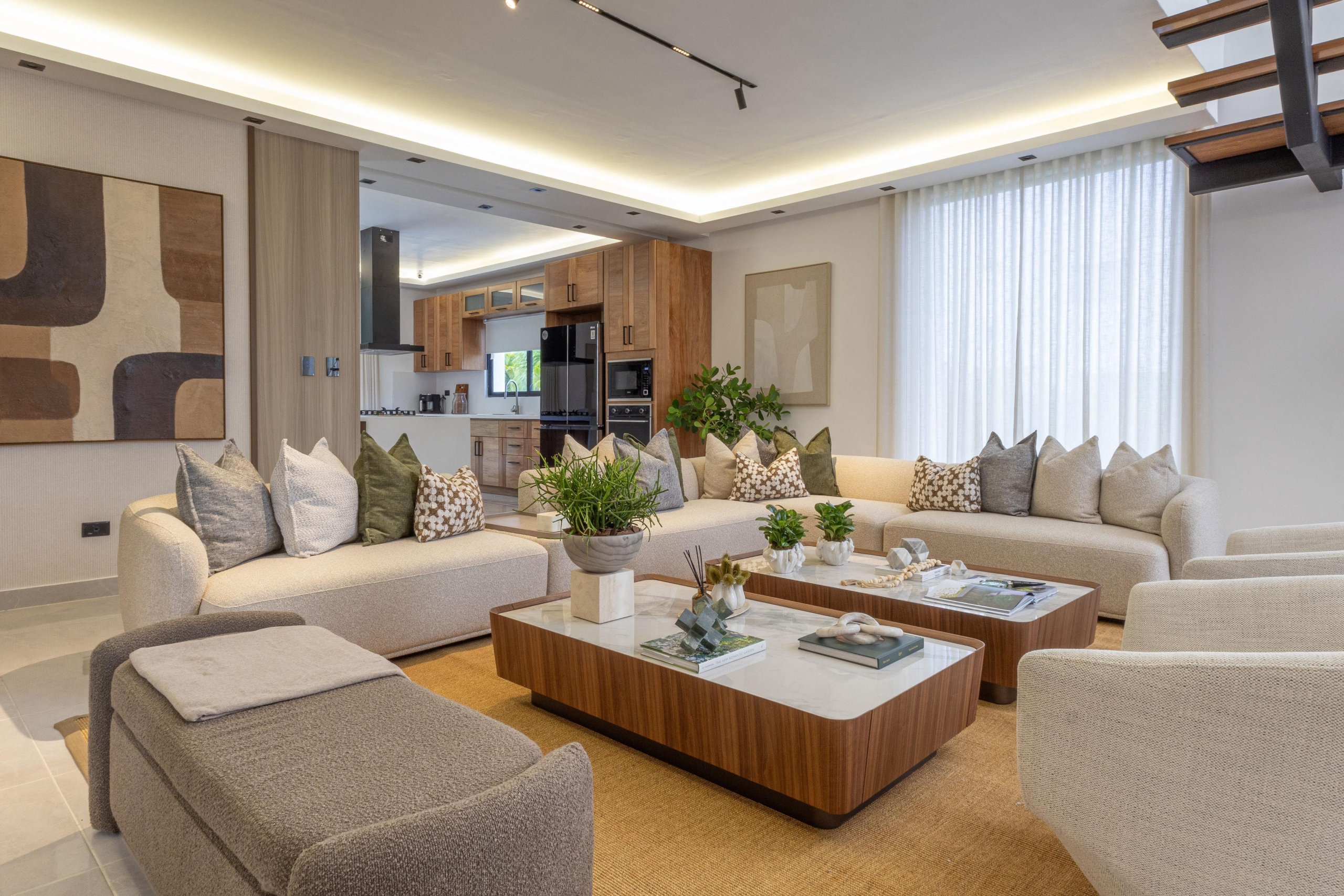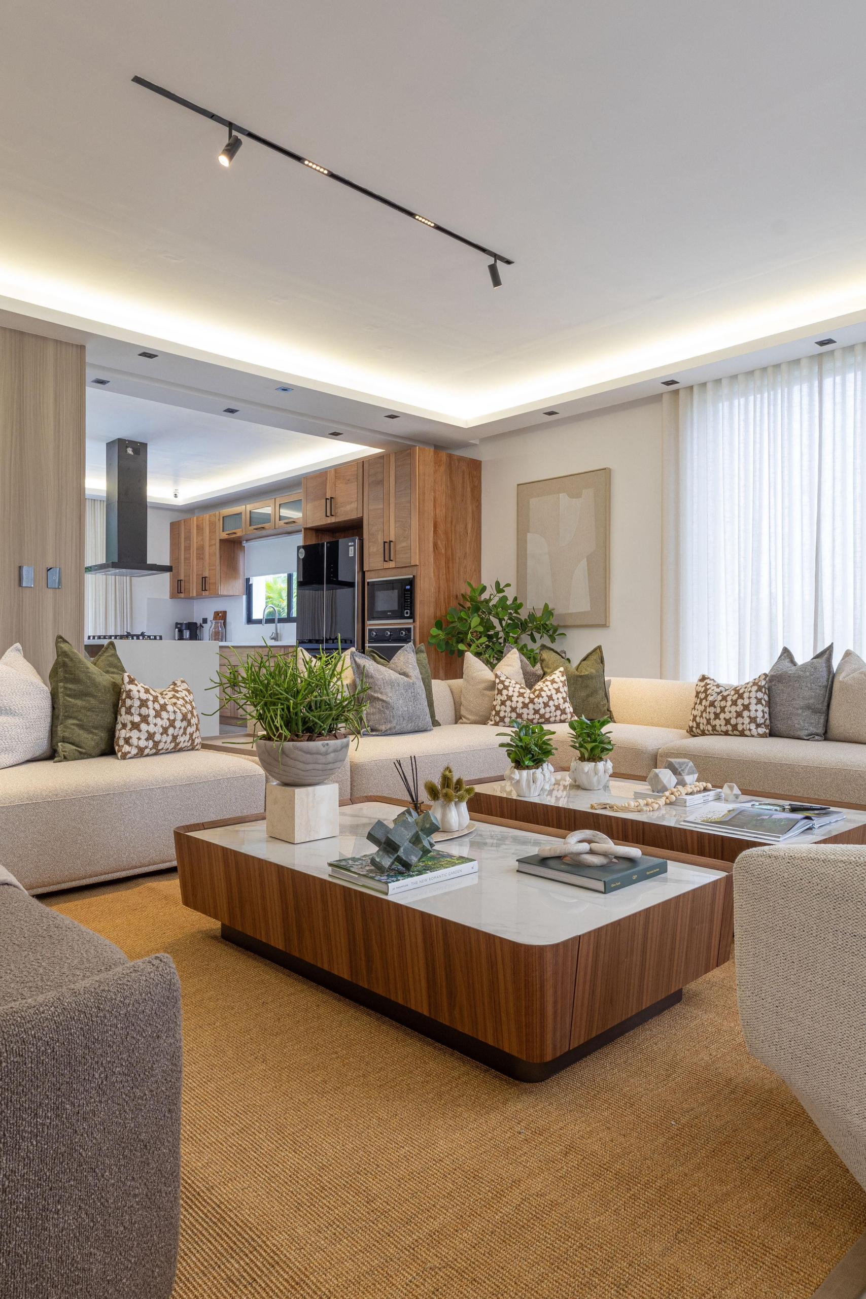 La distribución abierta integra sala, comedor y cocina de manera fluida, potenciando la entrada de luz natural y favoreciendo la conexión entre los espacios. El mobiliario de líneas suaves, las texturas textiles y la presencia de vegetación refuerzan el carácter relajado del diseño, mientras que la iluminación indirecta realza los volúmenes arquitectónicos y añade profundidad y calidez.
